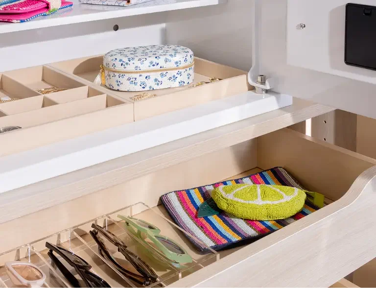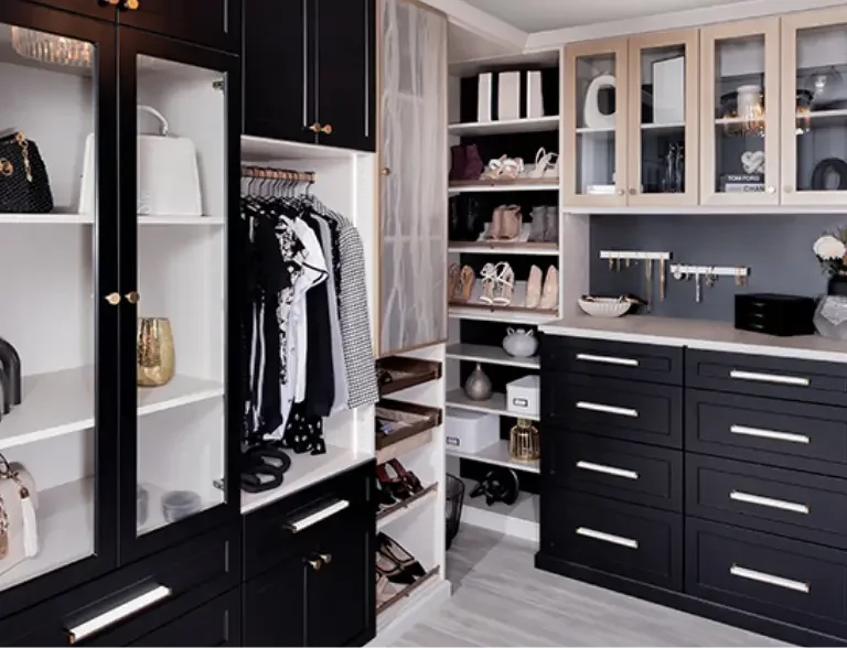 Magnolia’s closet systems are more than just organized—they’re beautifully integrated into your daily life. Our designs include built-in LED lighting, soft-close drawers, and cabinet doors with custom finishes like glass or wood to match your aesthetic. Whether you need dedicated storage for shoes, handbags, jewelry, or everyday essentials, we craft every element to reflect your style and elevate your routine.