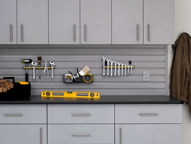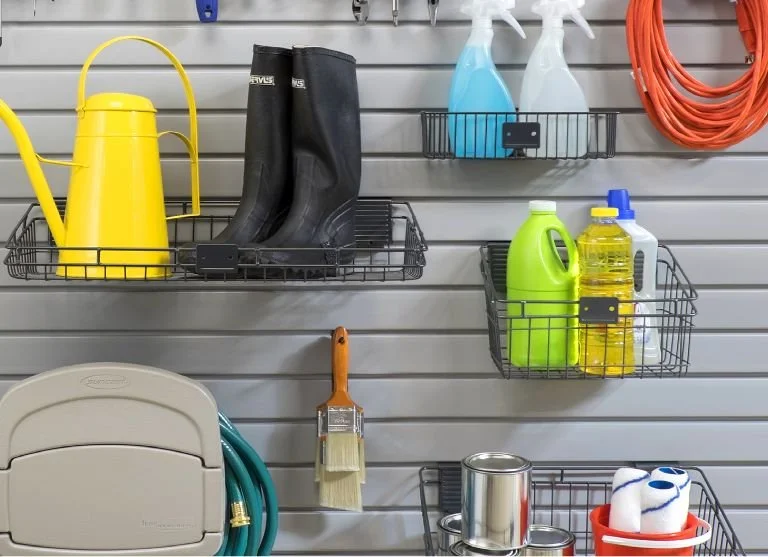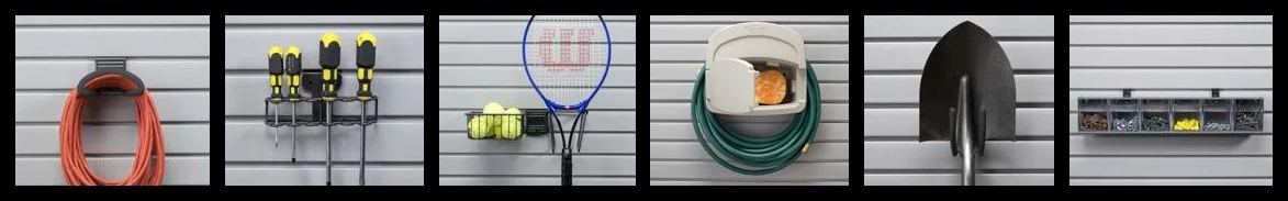 Our wall-mounted slatwall system makes it easy to keep your garage organized and clutter-free. Start with durable PVC panels, then add hooks, racks, baskets, and specialty holders—all designed to snap into place without tools. From sports gear to tools and seasonal items, every piece is adjustable, modular, and built to keep up with your changing needs.